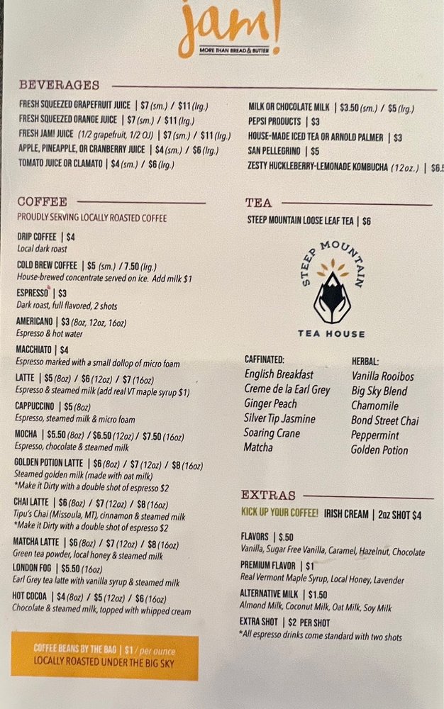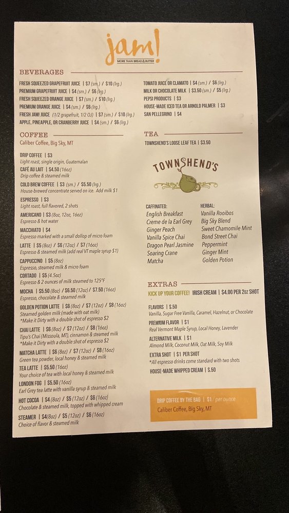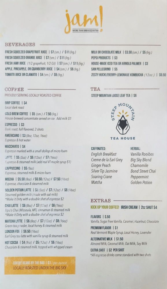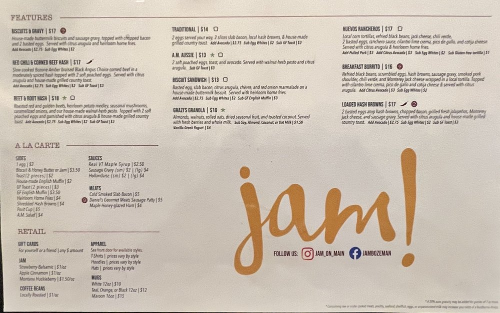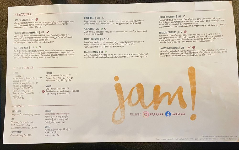 At Jam!, we celebrate the art of breakfast and brunch with a vibrant menu that showcases the essence of local flavors and creativity. Nestled in Bozeman, MT, our casual and trendy eatery is dedicated to crafting memorable dining experiences. From housemade jam on grilled country toast to indulgent cinnamon roll pancakes, our dishes are thoughtfully prepared to satisfy every palate. With vegan options and a commitment to fresh ingredients, we provide a welcoming space for everyone—from families to foodies. Join us for a meal that delights the senses, and discover why our guests can’t resist returning for more of Jam!'s culinary magic.